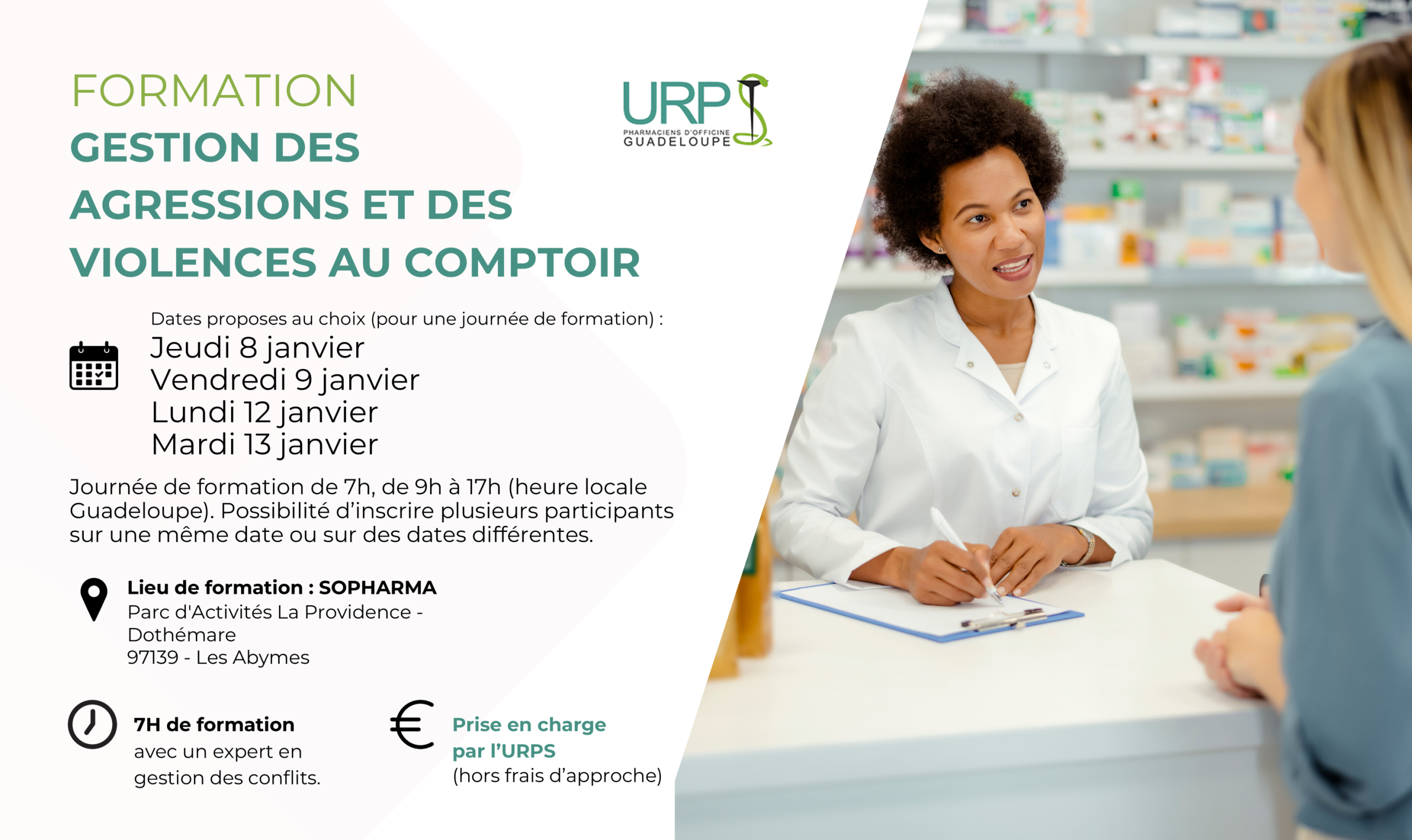 Face à la recrudescence des incivilités et agressions au comptoir, l’URPS Pharmaciens de Guadeloupe propose une formation pratique et prise en charge à 100 % (hors frais