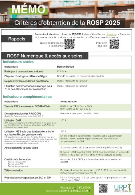ROSP Pharmaciens – Déclaration des indicateurs 2025ROSP Depuis le 1er janvier 2026, la saisie des indicateurs ROSP exercice 2025 est ouverte. ATTENTION : la date limite est ce vendredi 27 février 2026, dernier délai, sur Amelipro (téléservice « Ma Convention »).